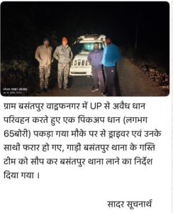 आनें‌ वाला ग्राम पंचायत बसंतपुर (लमोरी) में नायब तहसीलदार के द्वारा उत्तर प्रदेश से तस्करी कर लाए जा रहे लगभग 65 बोरी अवैध धान से लदी एक बिना नंबर प्लेट की पिकअप वाहन को पकड़ा गया था।